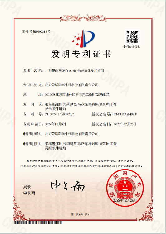 重磅突破!北京荣瑷再添新专利,靶向密蛋白18.2纳米抗体为实体瘤治疗注入新动能